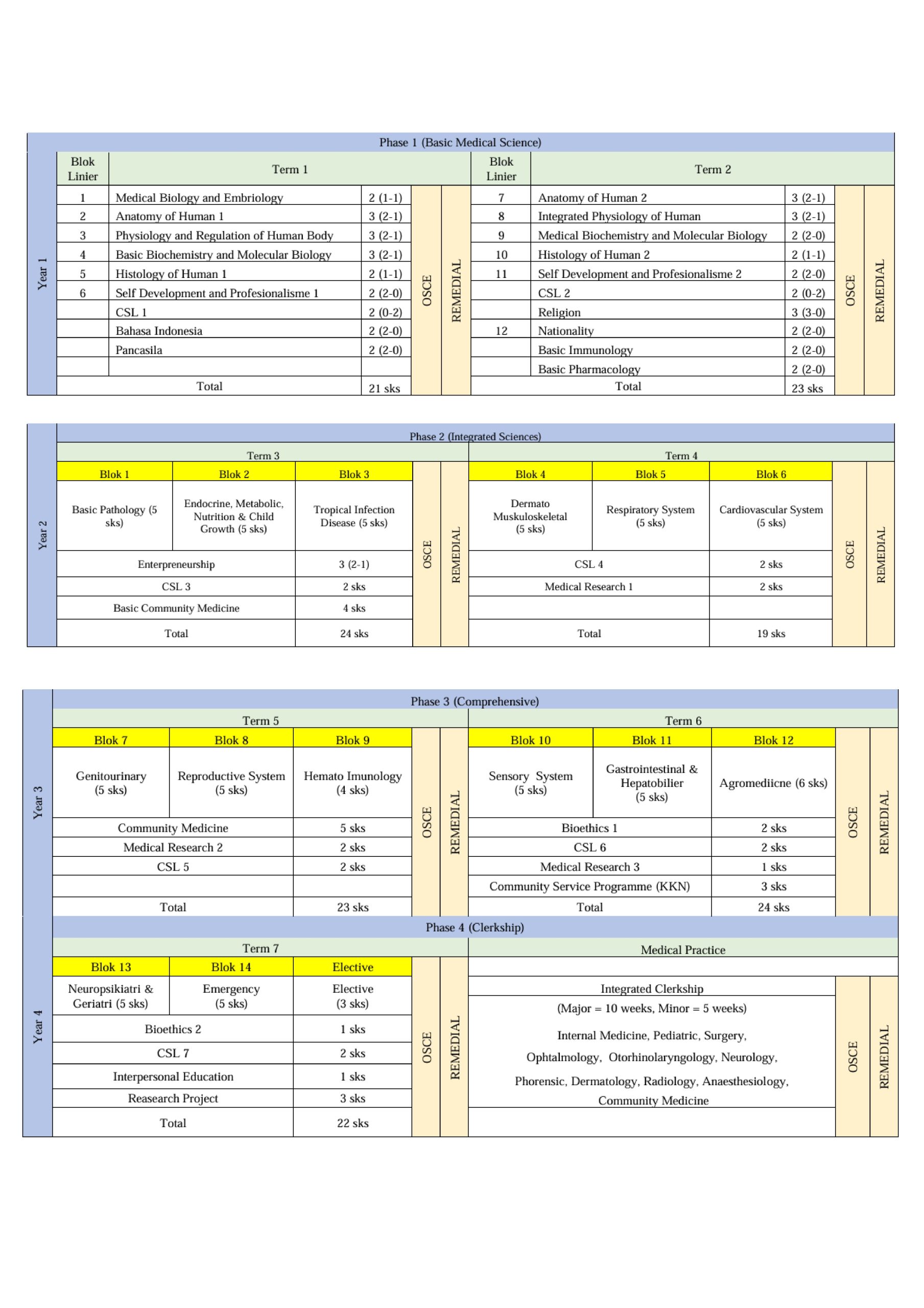 Capaian Pembelajaran yang diharapkan (Intended Learning Outcome) dibagi menjadi capaian pembelajaran umum dan capaian pembelajaran profesional. Capaian pembelajaran umum merupakan capaian pembelajaran komunikasi dan kerja sama tim. Capaian pembelajaran profesional meliputi capaian konsep dan keterampilan teoritis di bidang kedokteran. Untuk mencapai profil lulusan Program Studi Kedokteran Fakultas Kedokteran Universitas Lampung (Program Eduaction Outcome/PEO) yaitu 1) Dokter yang kompeten dan memiliki pengetahuan di bidang agromedicine; 2) Akademisi dan Peneliti; 3) Agen perubahan, dan 4) Wirausahawan. Oleh karena itu, capaian pembelajaran (Program Learning Outcome/PLO) pada setiap modul pembelajaran telah dirancang dalam dokumen kurikulum sebagaimana ditunjukkan pada Tabel 5 Capaian Pembelajaran yang diharapkan. Struktur kurikulum Program Studi Kedokteran Fakultas Kedokteran Universitas Lampung terbagi dalam 7 semester. Beban studi di Indonesia ditetapkan berdasarkan satuan kredit semester. Total beban studi yang harus ditempuh mahasiswa untuk lulus dari Program Studi Kedokteran Fakultas Kedokteran Universitas Lampung adalah 154 SKS atau setara dengan 233 European Credit Transfer and Accumulation System (ECTS). Artinya, beban studi di Program Studi Kedokteran Fakultas Kedokteran Universitas Lampung sudah sesuai dengan standar. Selain kompetensi inti, lulusan Program Studi Kedokteran harus memiliki kompetensi tambahan agromedik yaitu spesialisasi Program Studi Kedokteran Fakultas Kedokteran Universitas Lampung. Konten agromedik terintegrasi dalam kurikulum Program Studi Kedokteran.